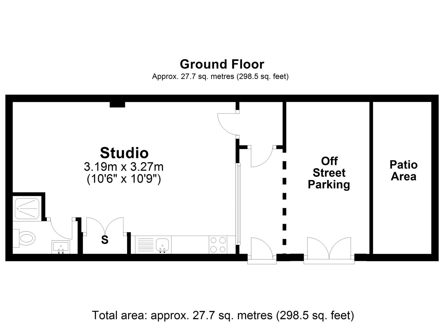 Open Plan Studio Room/Kitchen - Double glazed window, power point, wall lights, double wardrobe door to shower room.